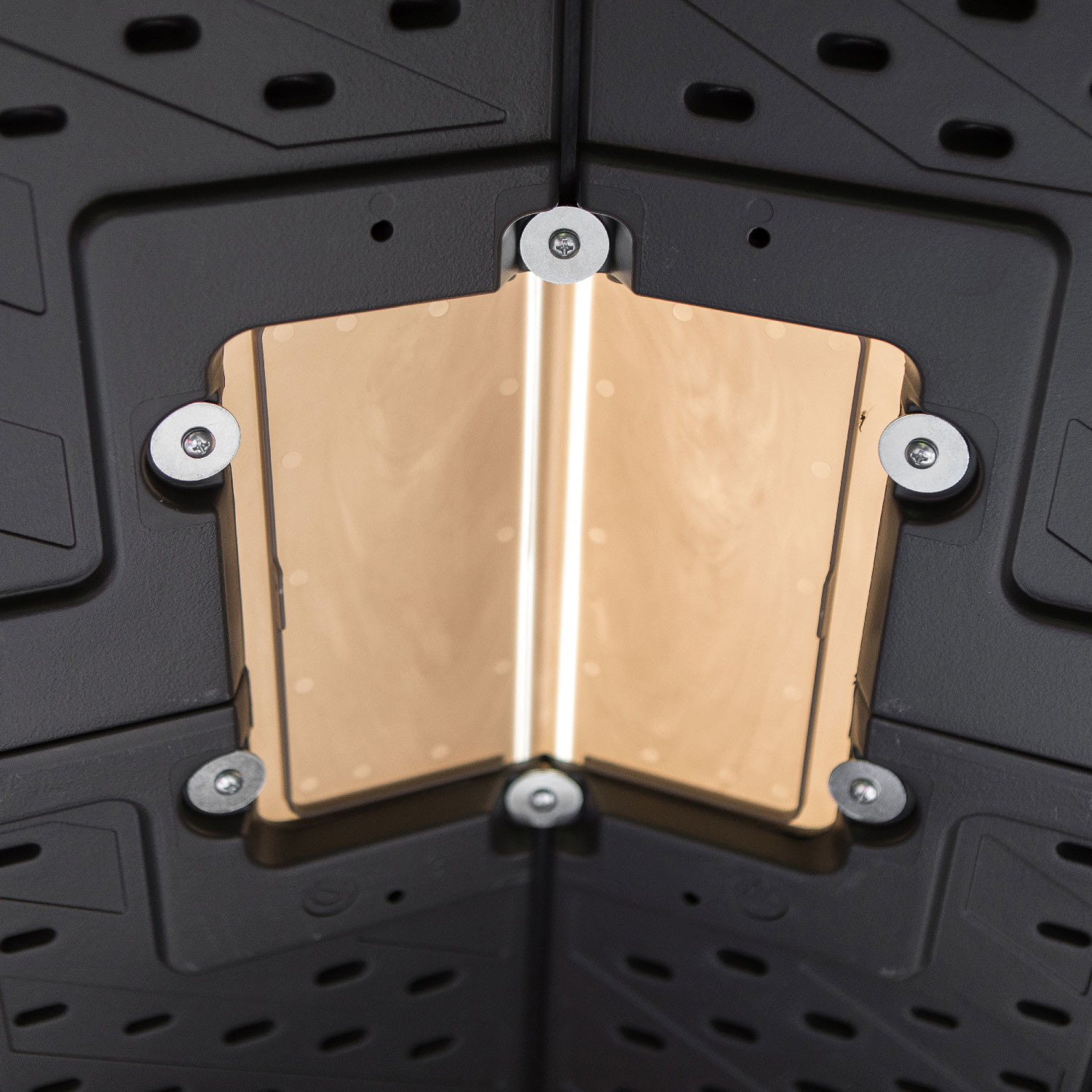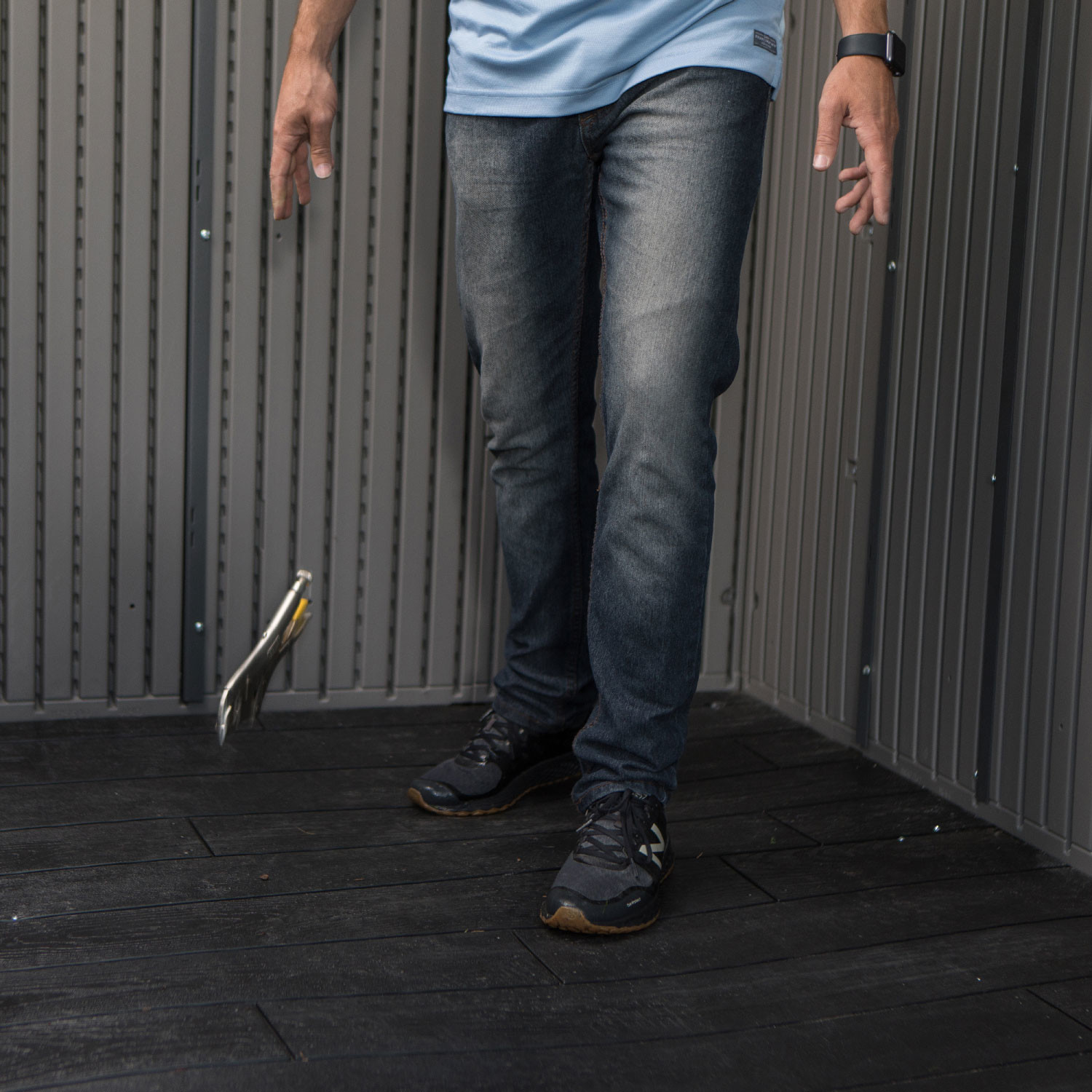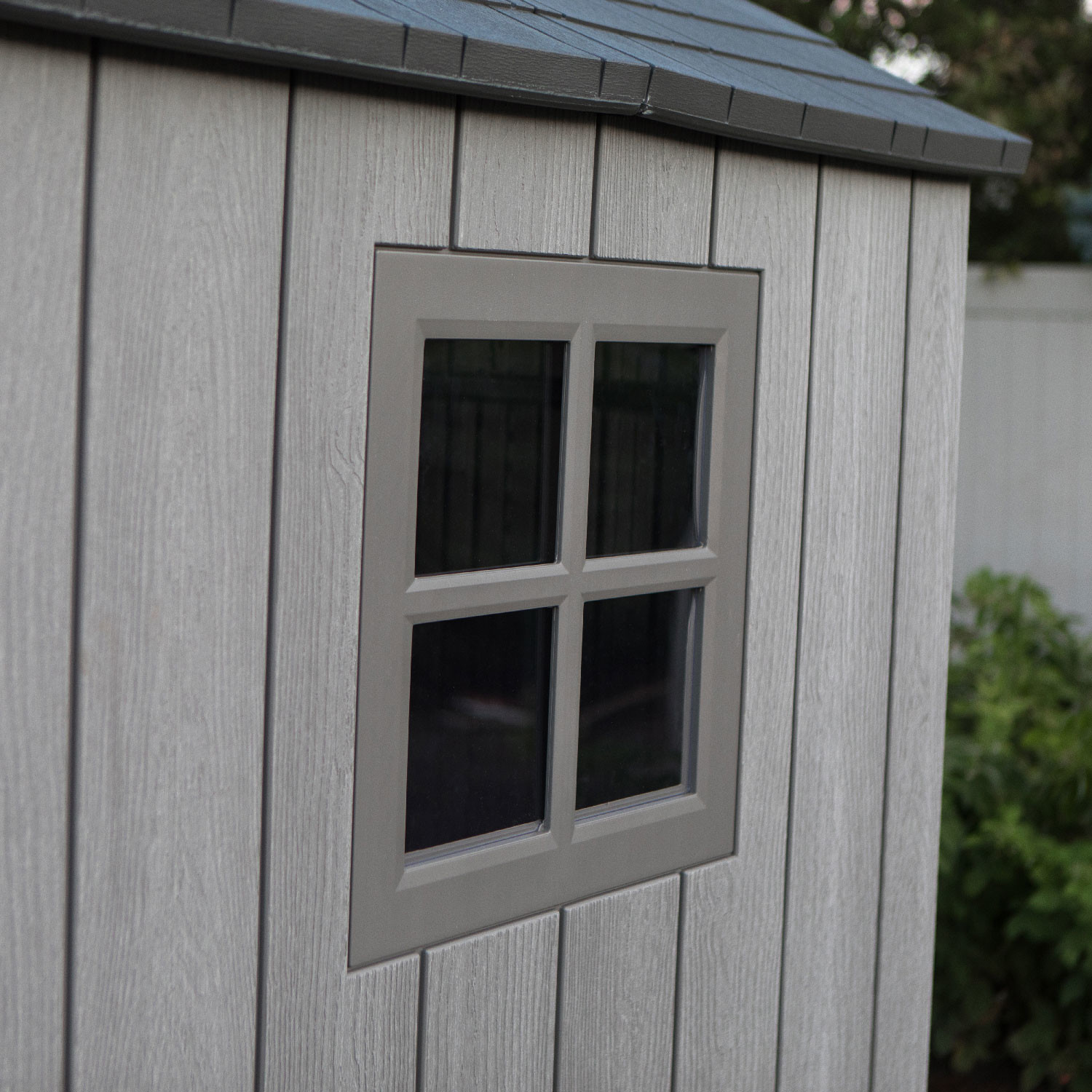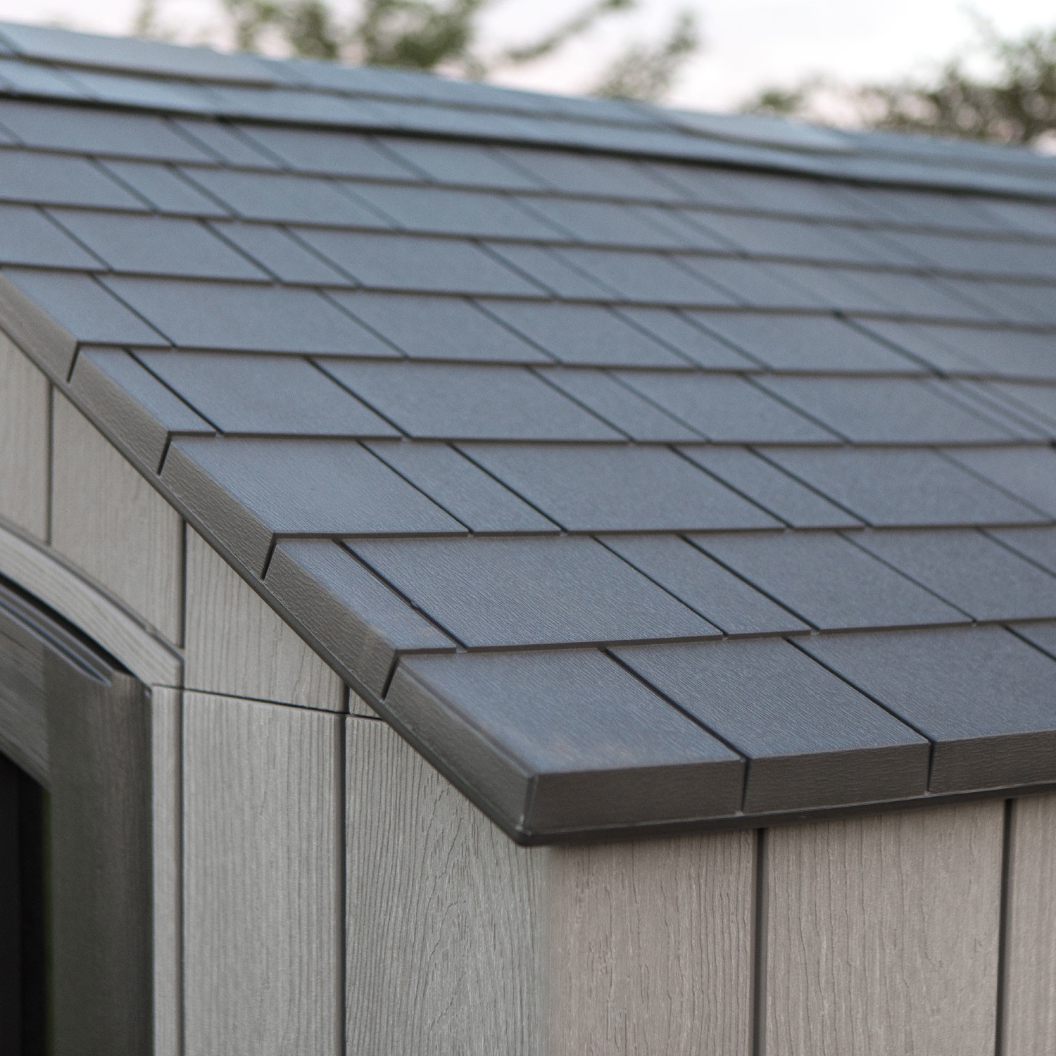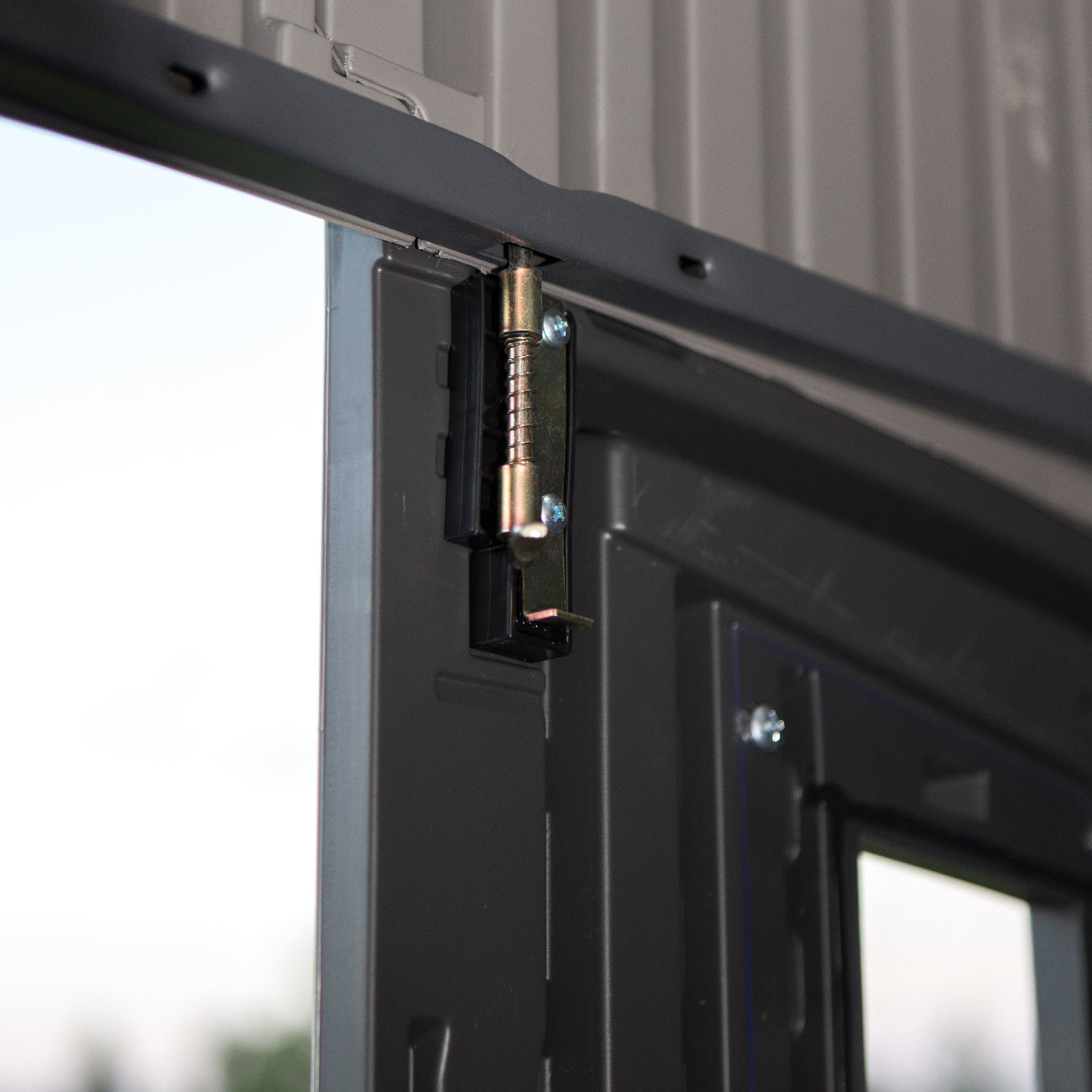 Casetta in polietilene alta densità a doppia parete (HDPE). Colore grigio con venature effetto legno, finitura spazzolata ruvida. Tetto realizzato con capriate in acciaio e dotato di lucernario a tutta lunghezza. Porta rinforzata con componenti acciaio; chiusura