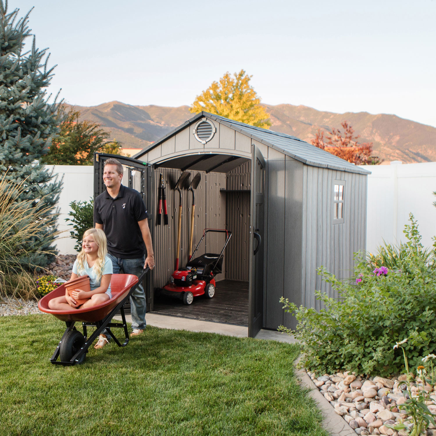 Casetta in polietilene alta densità a doppia parete (HDPE). Colore grigio con venature effetto legno, finitura spazzolata ruvida. Tetto realizzato con capriate in acciaio e dotato di lucernario a tutta lunghezza. Porta rinforzata con componenti acciaio; chiusura con chiavistello. Completa di nr. 1 mensola da cm. 230x30 e nr. 6 ganci a parete. La mensola può essere posizionata in base alle proprie esigenze. I tanti ganci a parete, sono la soluzione ideale per appendere e sistemare gli oggetti.