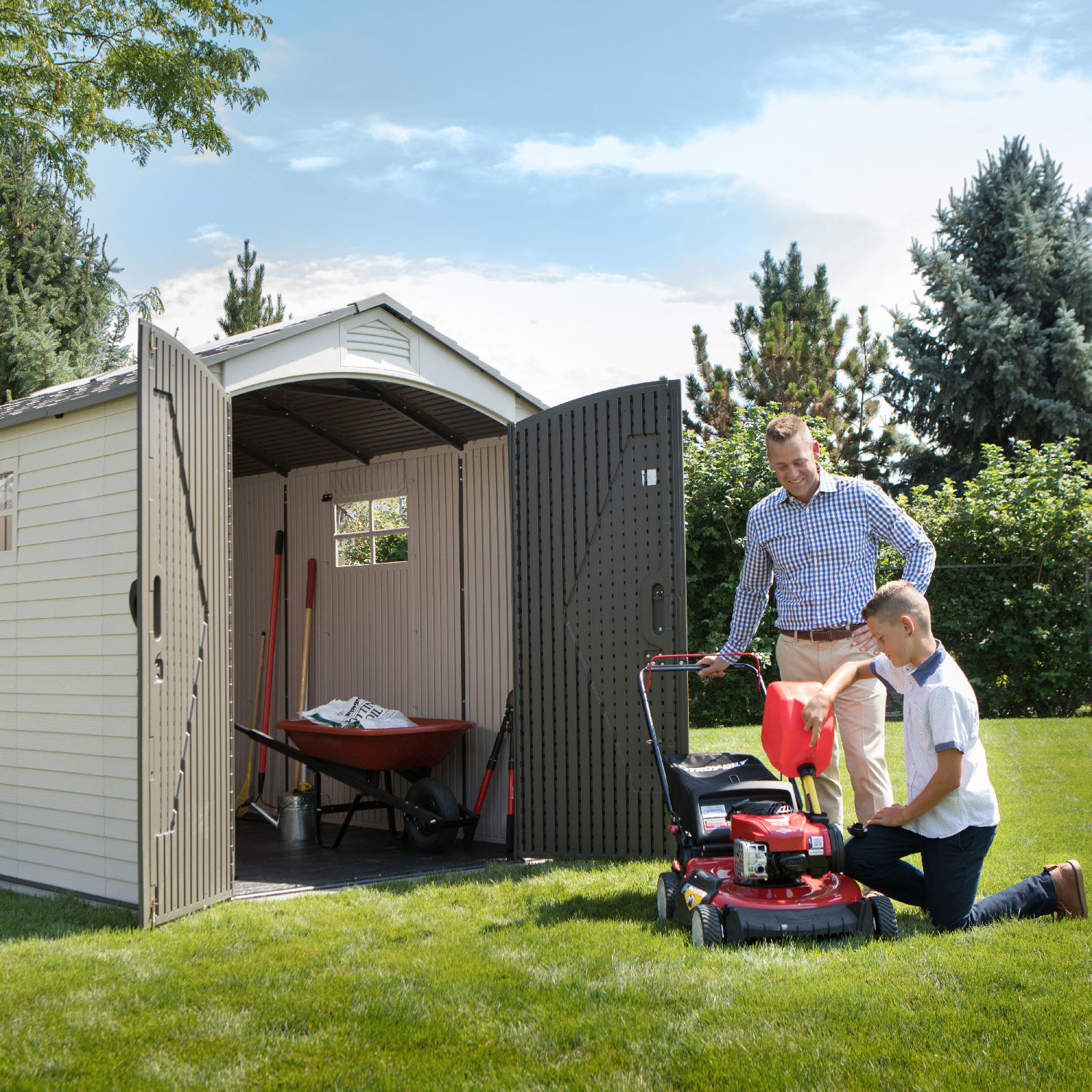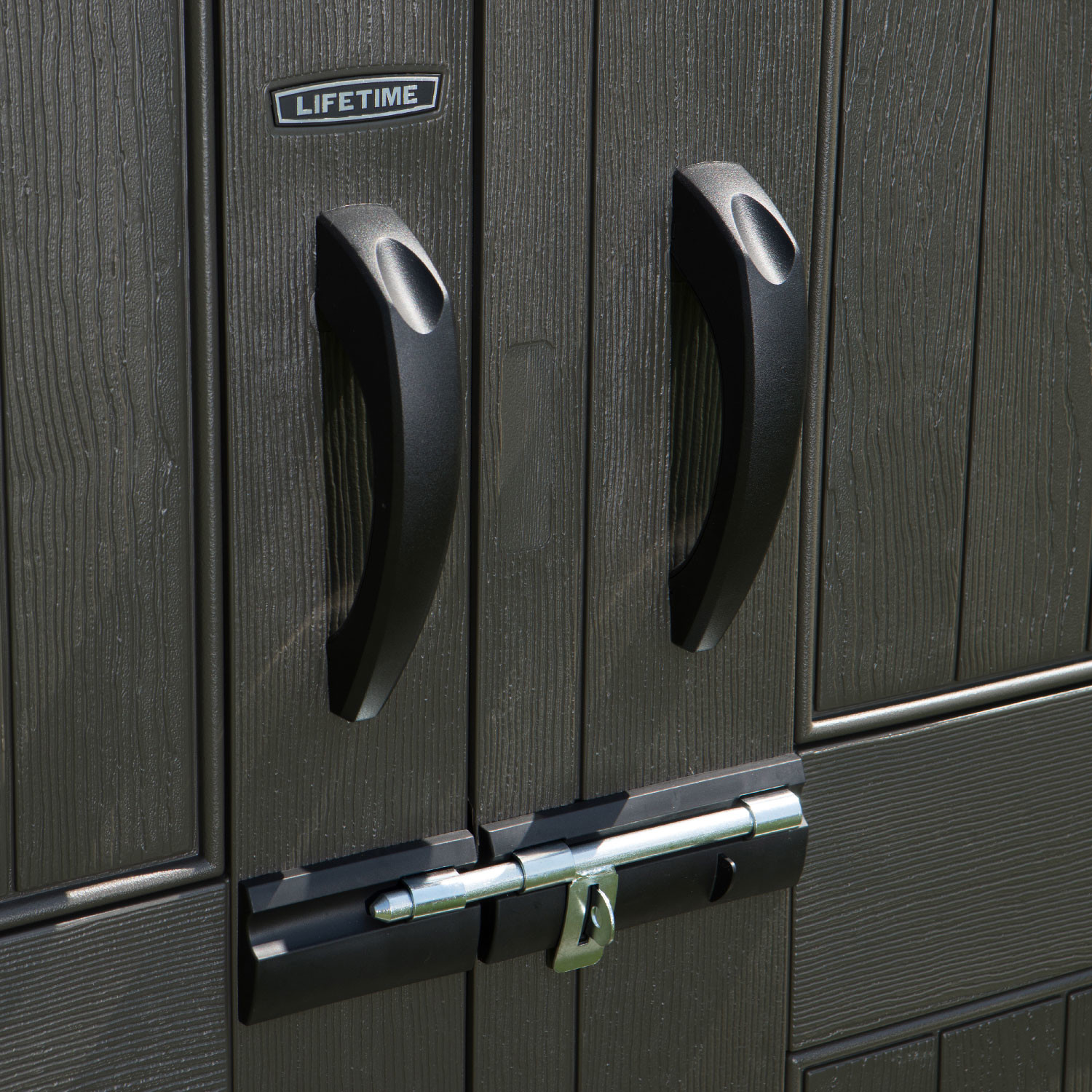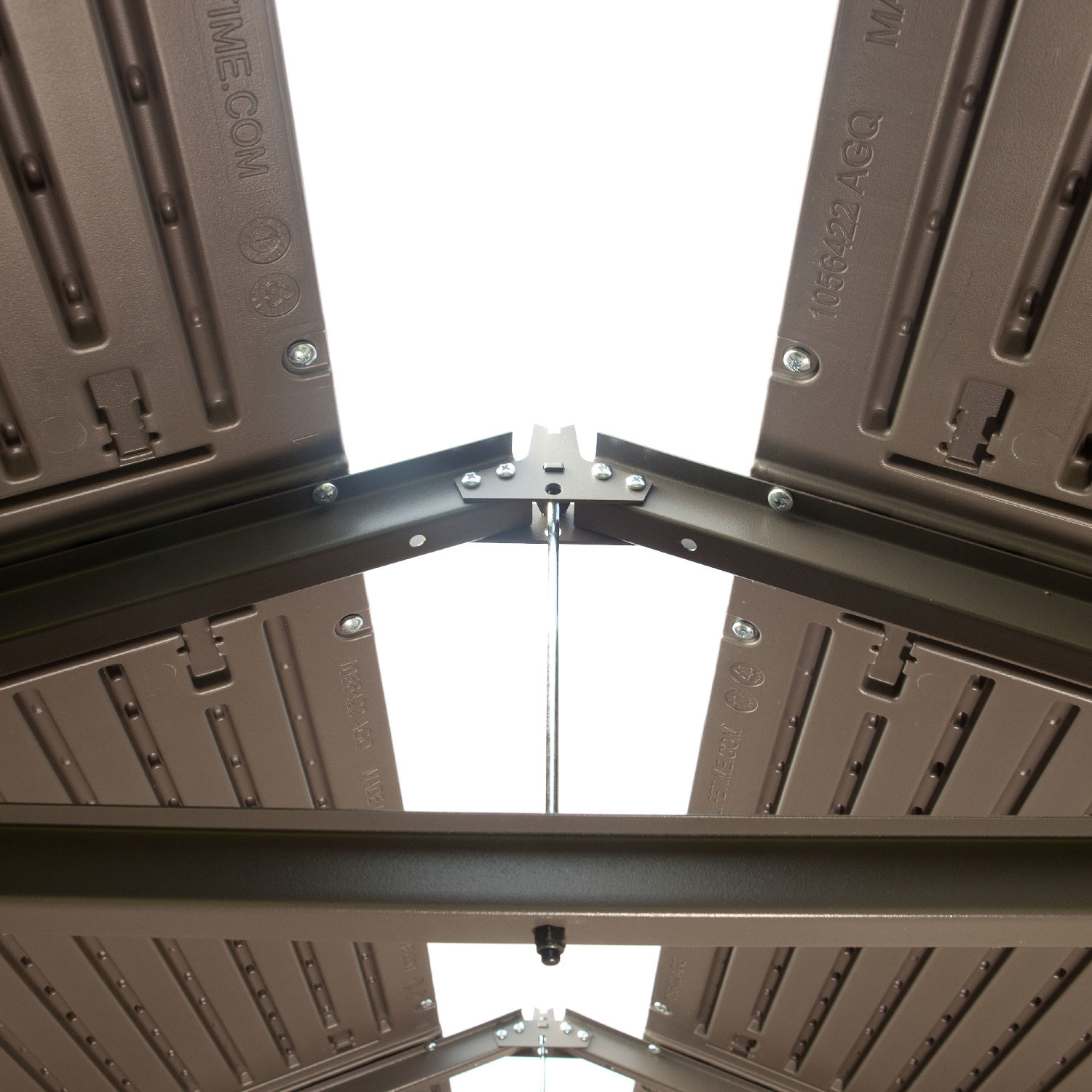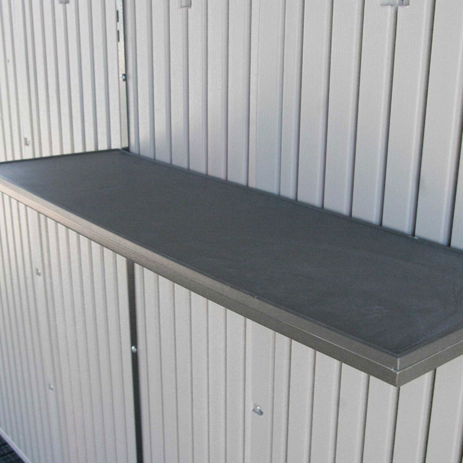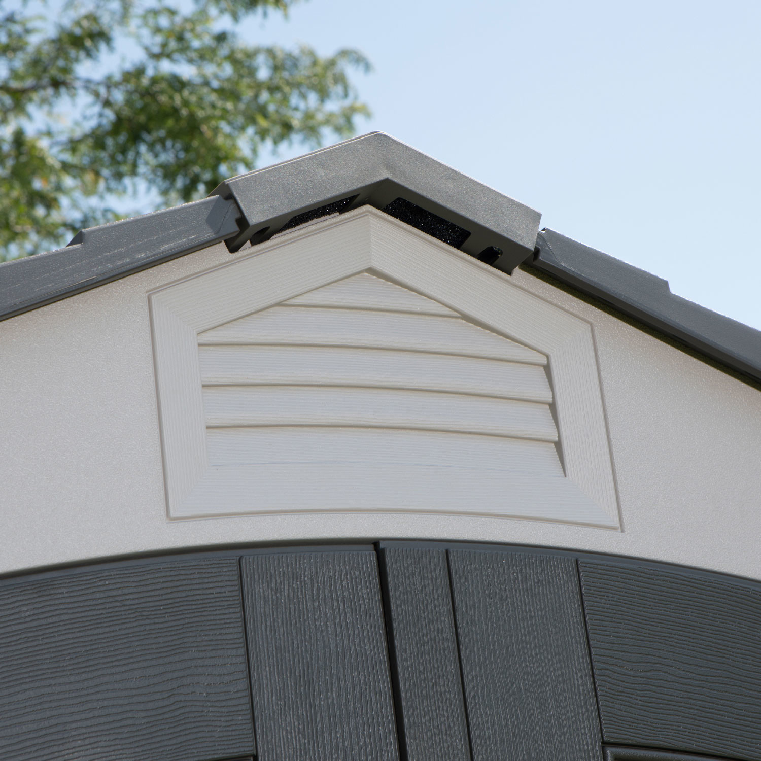 Casetta in polietilene alta densità a doppia parete (HDPE). Colore sabbia con venature effetto legno e porte color grigio scuro. Tetto realizzato con capriate in acciaio e dotato di lucernario a tutta lunghezza. Completa di nr. 1 mensola da cm. 75x25 e nr. 2 mensole ad angolo semicircolari raggio cm. 24