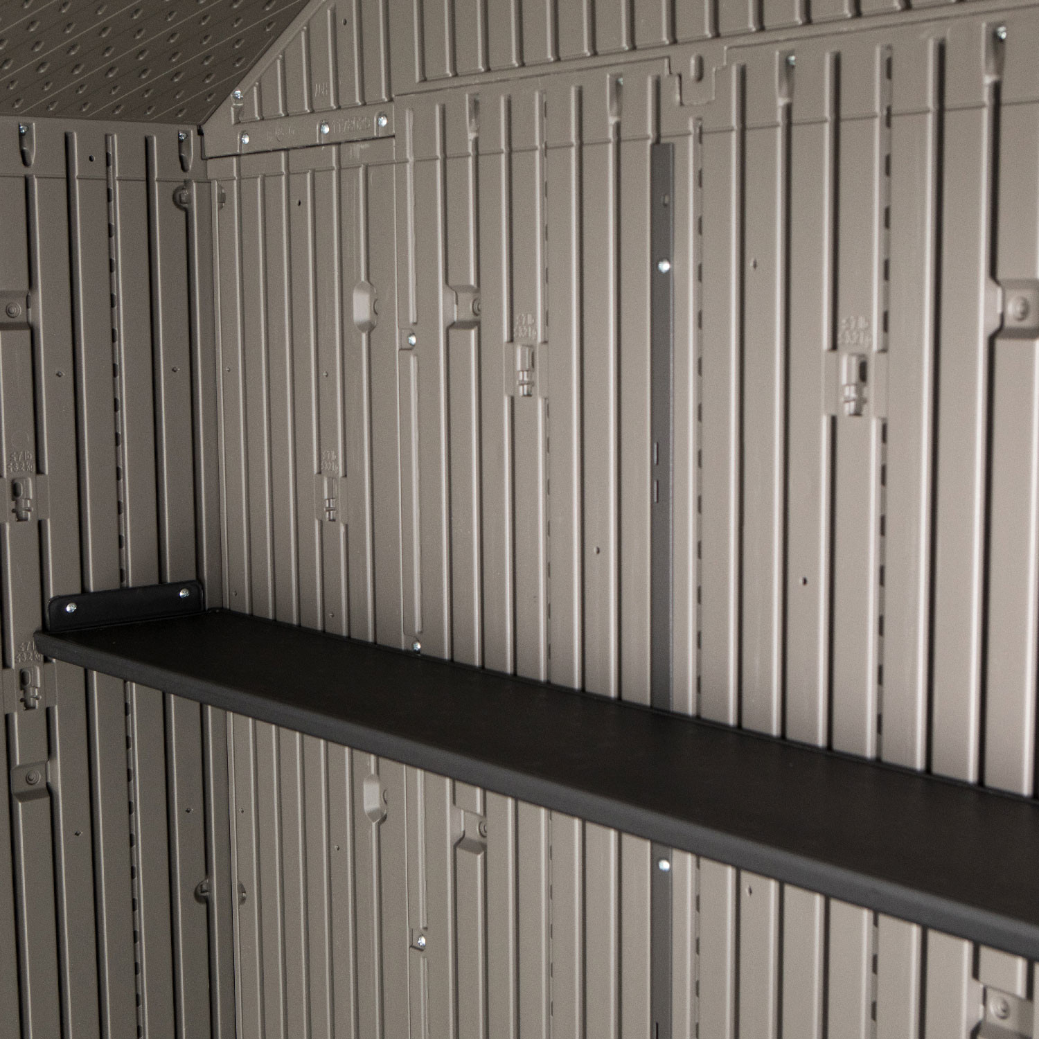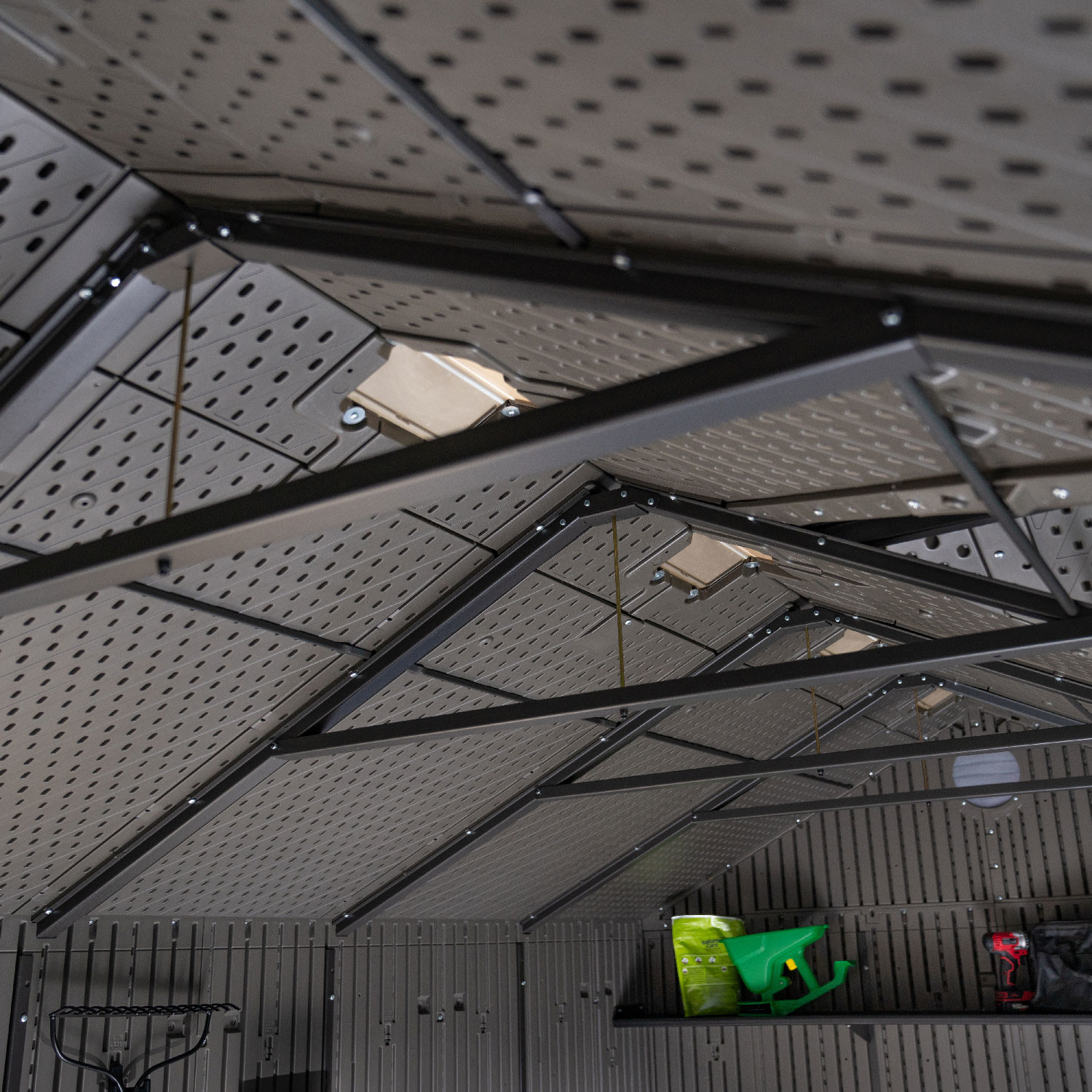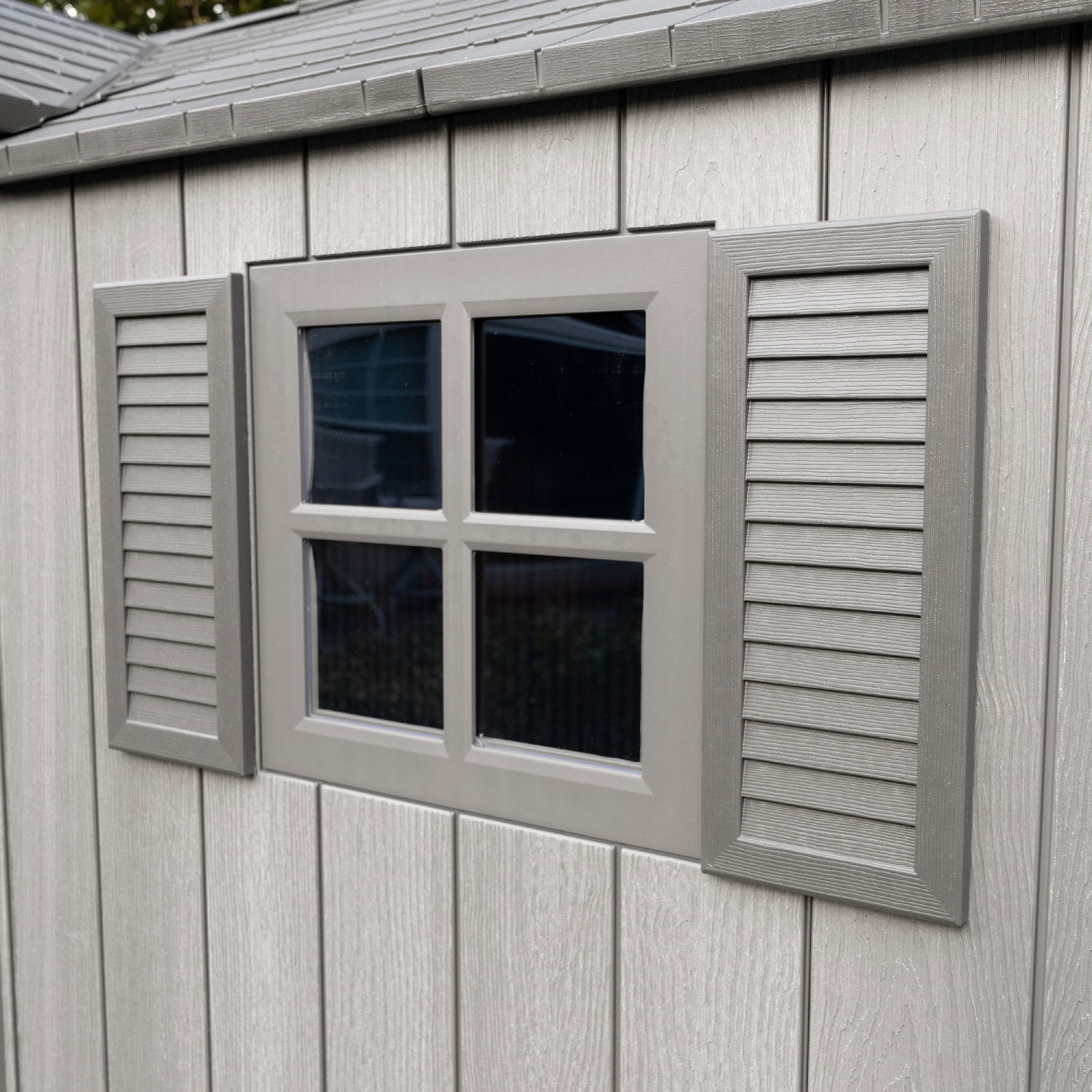 Casetta in polietilene alta densità a doppia parete (HDPE). Colore grigio con venature effetto legno, finitura spazzolata ruvida. Tetto realizzato con capriate in acciaio e dotato di lucernario a tutta lunghezza. Porta rinforzata con componenti in acciaio; chiusura