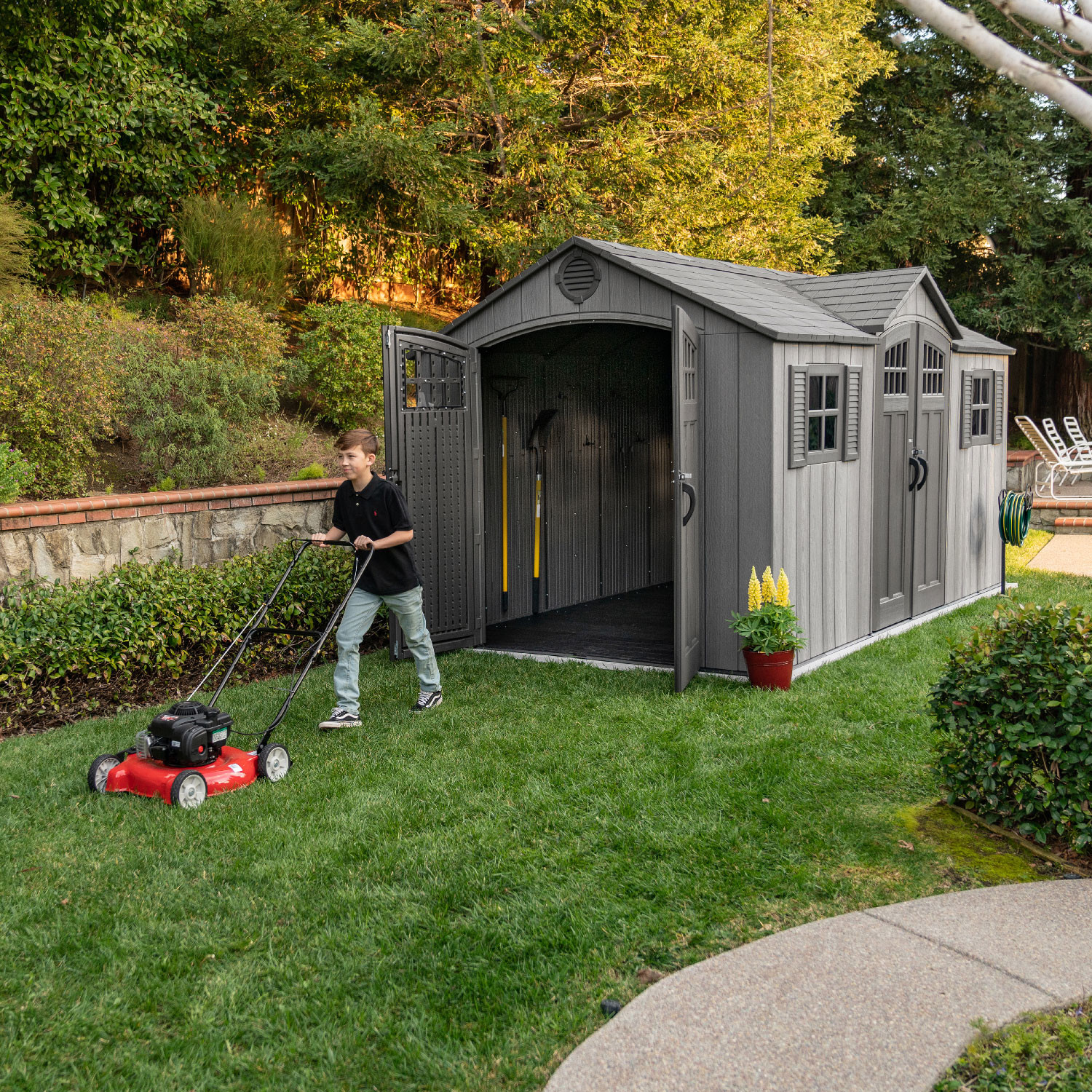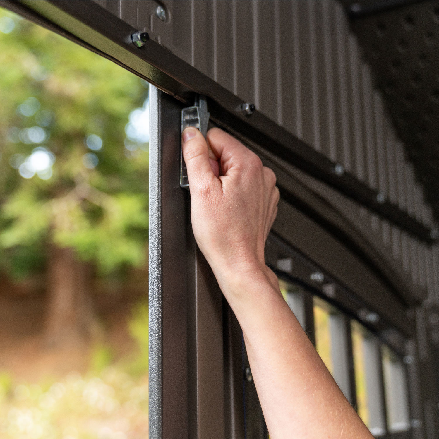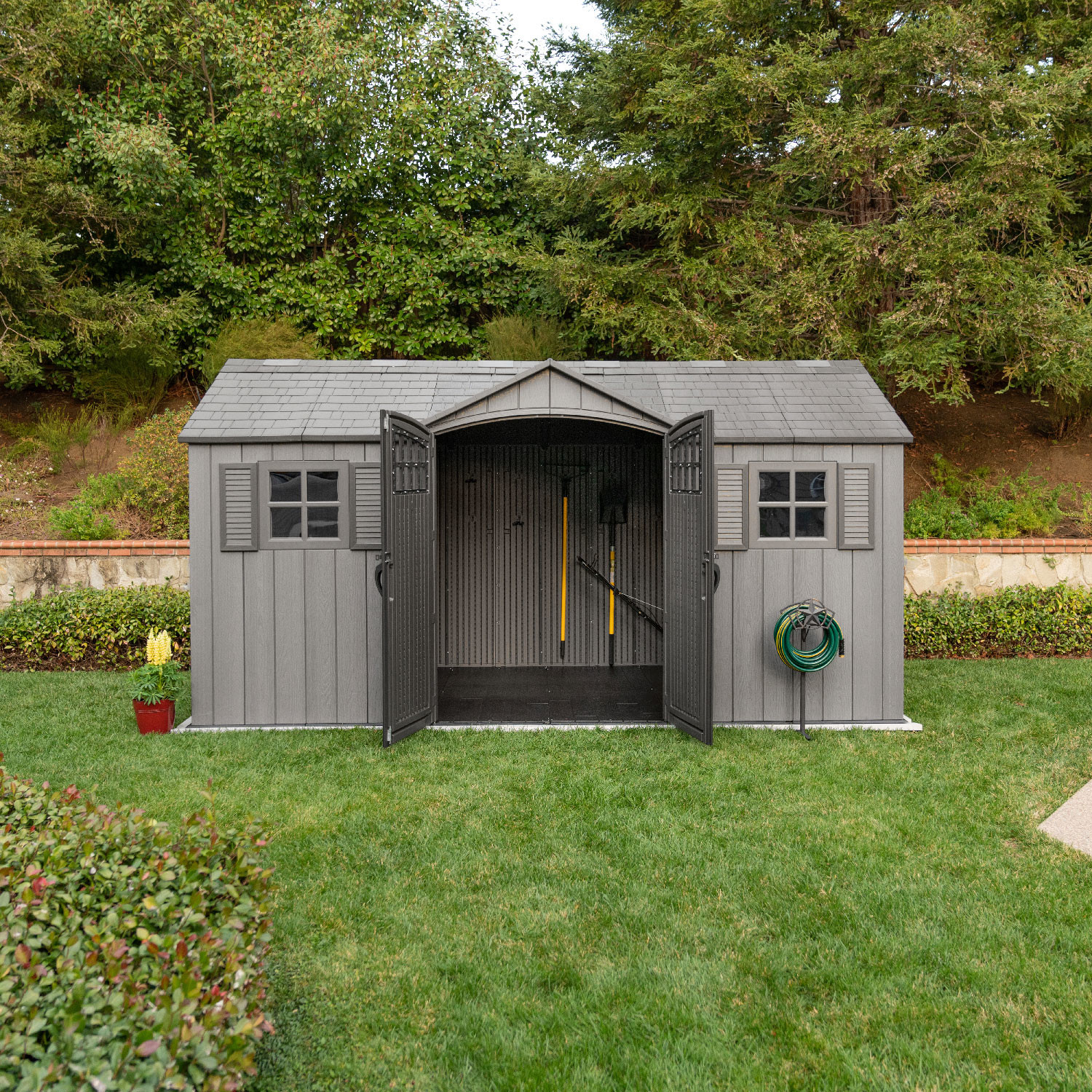 Casetta in polietilene alta densità a doppia parete (HDPE). Colore grigio con venature effetto legno, finitura spazzolata ruvida. Tetto realizzato con capriate in acciaio e dotato di lucernario a tutta lunghezza. Porta rinforzata con componenti in acciaio; chiusura