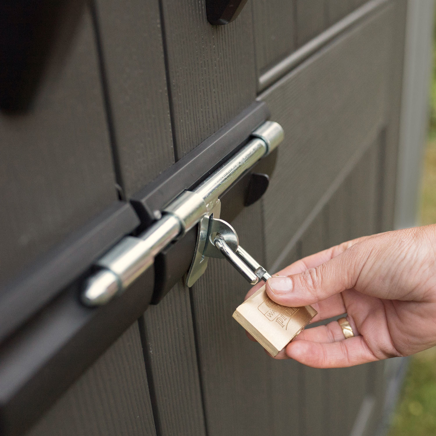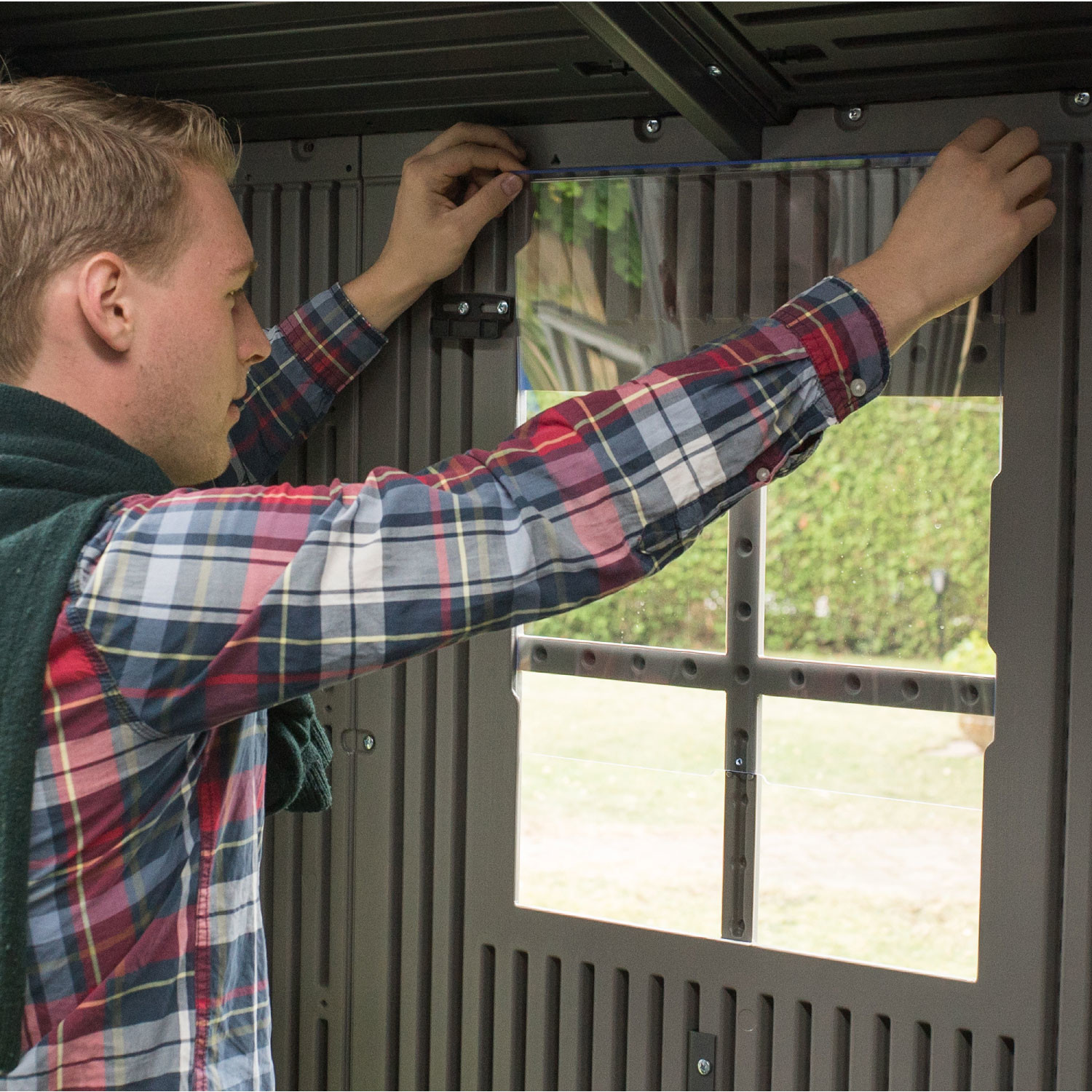 Casetta in polietilene alta densità a doppia parete (HDPE). Colore grigio con venature effetto legno, finitura spazzolata ruvida. Tetto realizzato con capriate in acciaio e dotato di lucernario a tutta lunghezza. Porta rinforzata con componenti acciaio; chiusura con chiavistello.