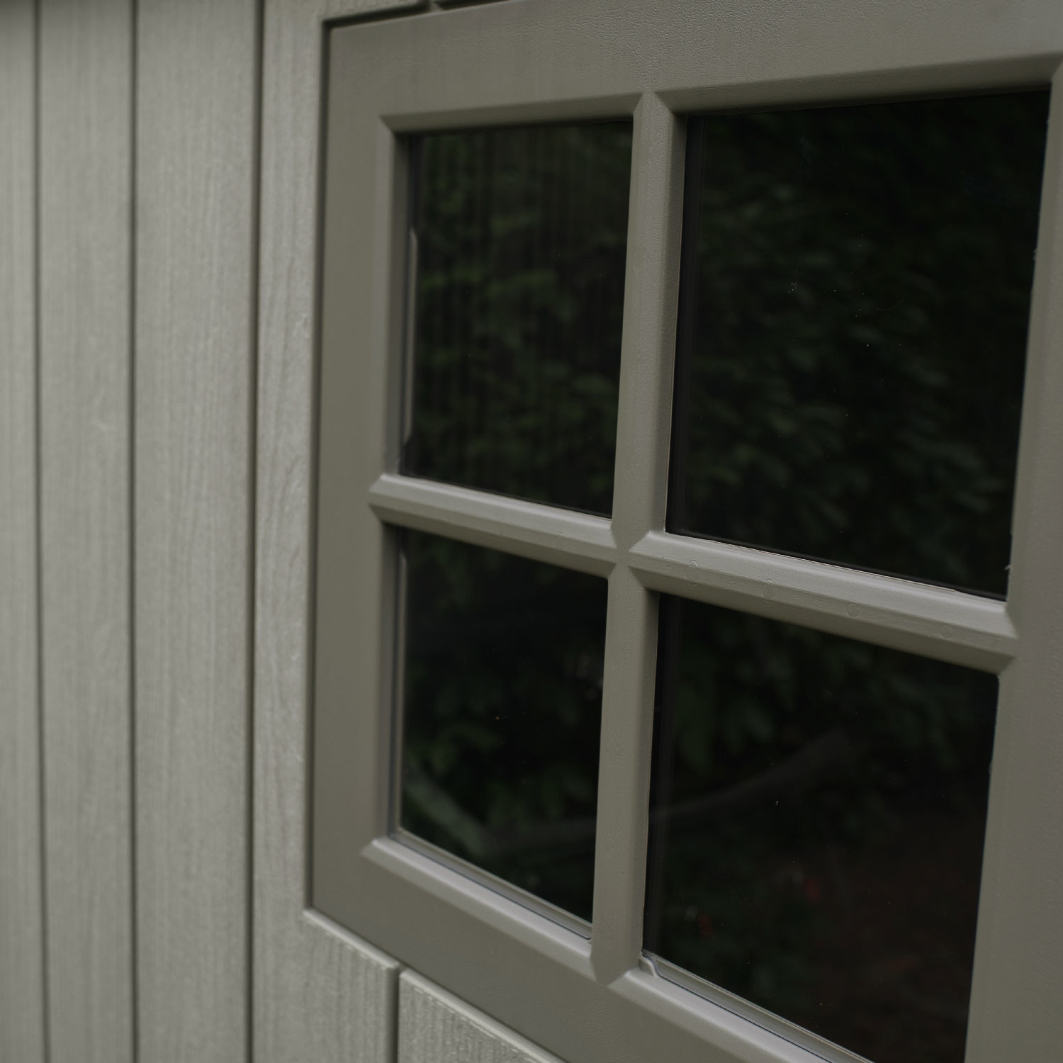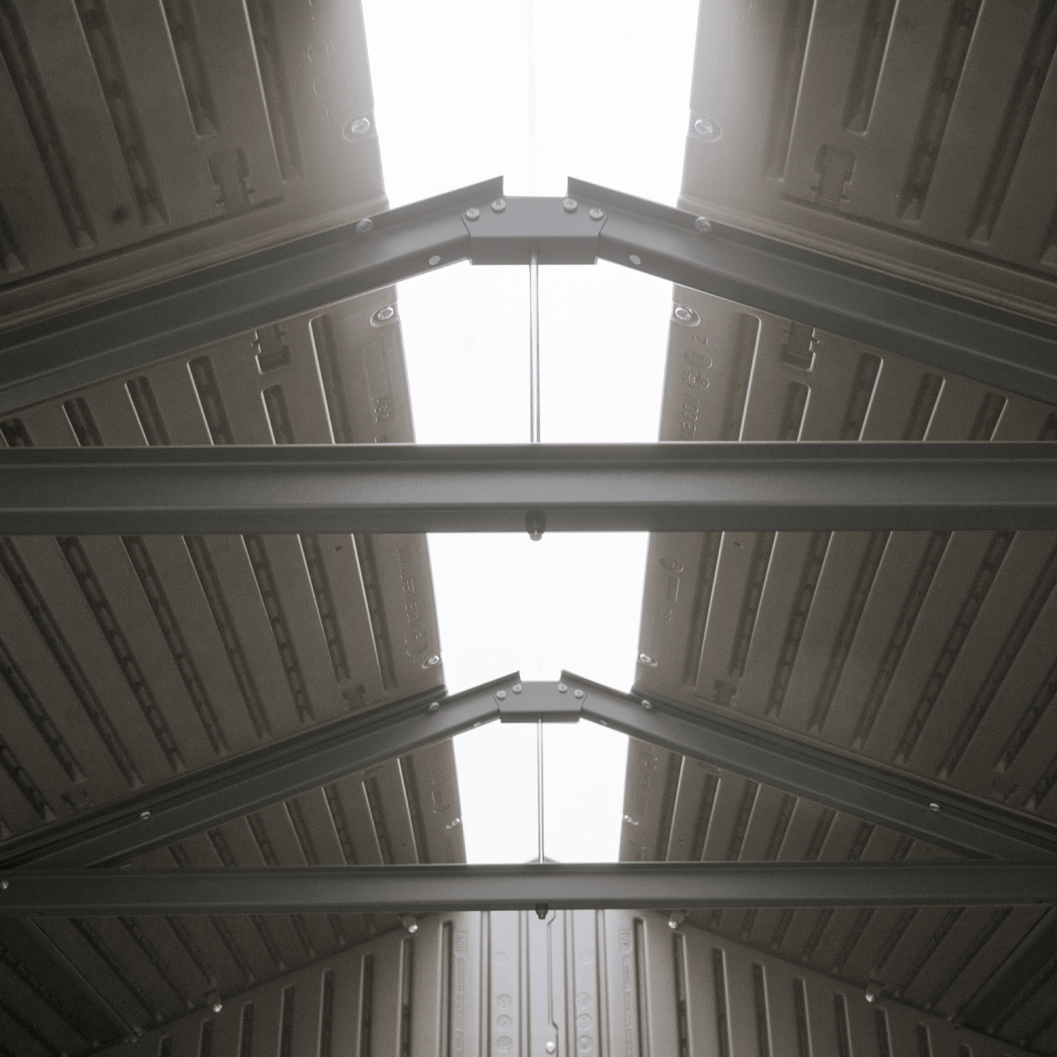 Casetta in polietilene alta densità a doppia parete (HDPE). Colore grigio con venature effetto legno, finitura spazzolata ruvida. Tetto realizzato con capriate in acciaio e dotato di lucernario a tutta lunghezza. Porta rinforzata con componenti acciaio; chiusura